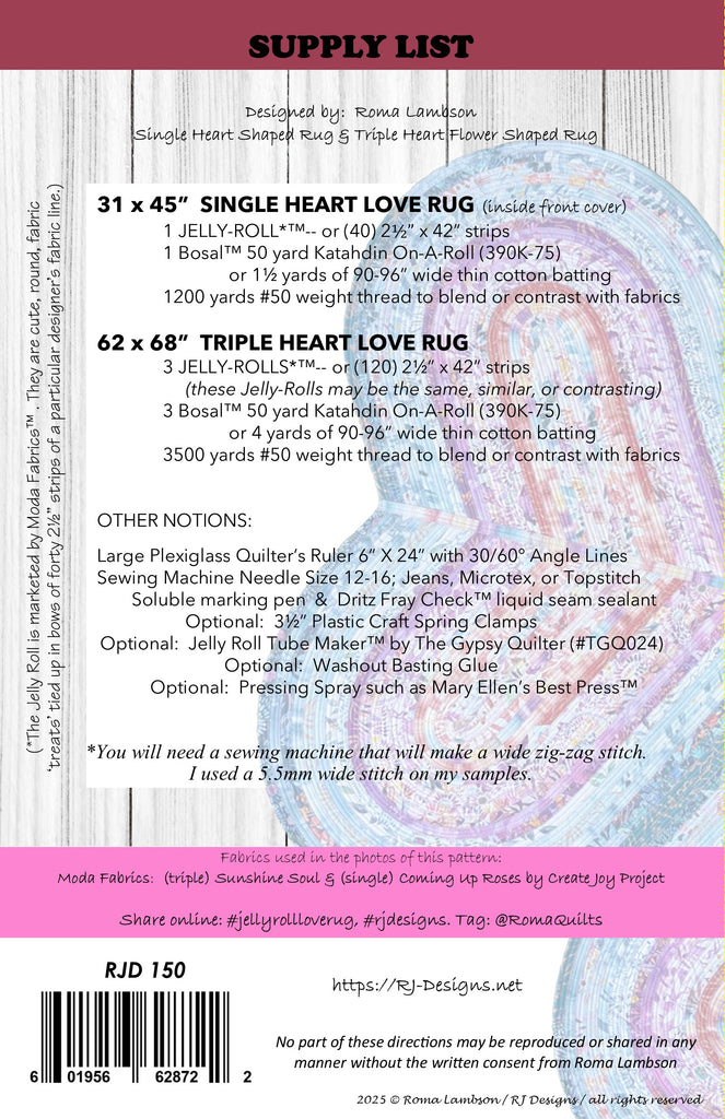 This listing is for a paper copy of the Jelly-Roll Love Rug pattern (RJD150).